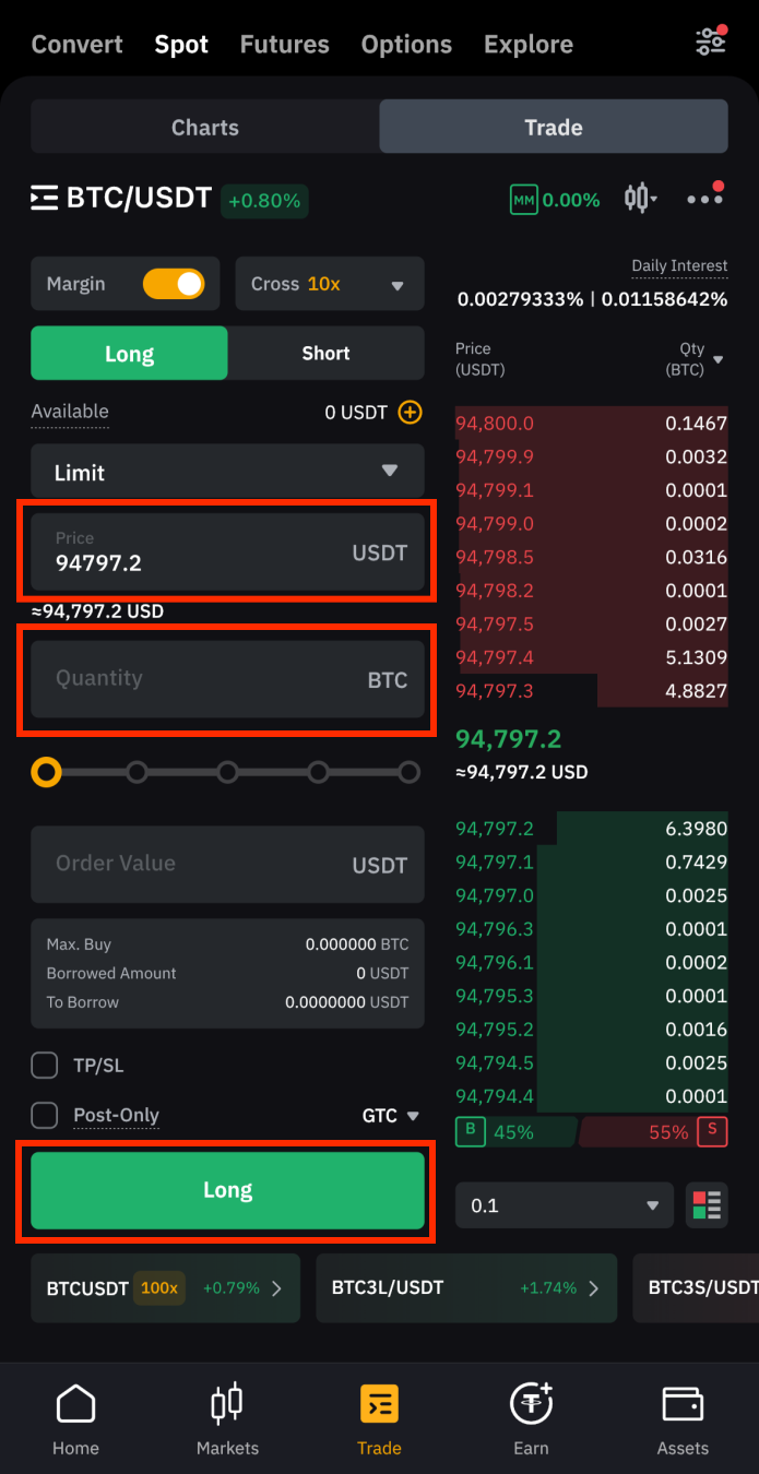 가격(Price)과 수량(Quantity)을 입력하고, Buy/Long 또는 Sell/Short를 클릭하면 주문이 체결됩니다.