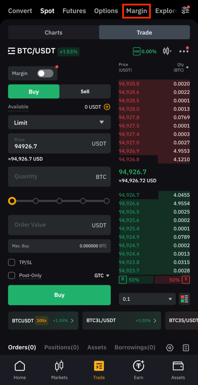 기본 설정은 'Spot' 거래로 되어 있으니, 상단에서 Margin을 선택해 마진 거래 화면으로 이동합니다.
