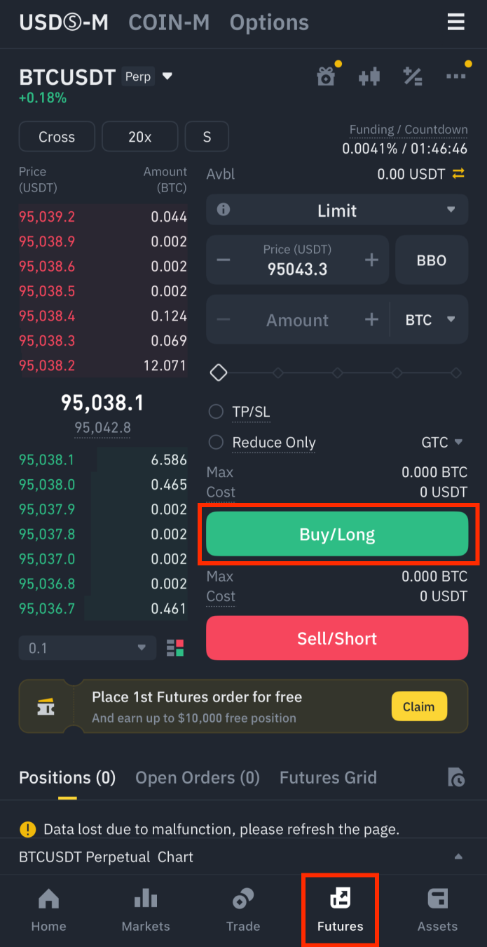 선물 거래를 시작하기 위해 먼저 Futures 메뉴에서 Buy/Long 버튼을 클릭합니다.