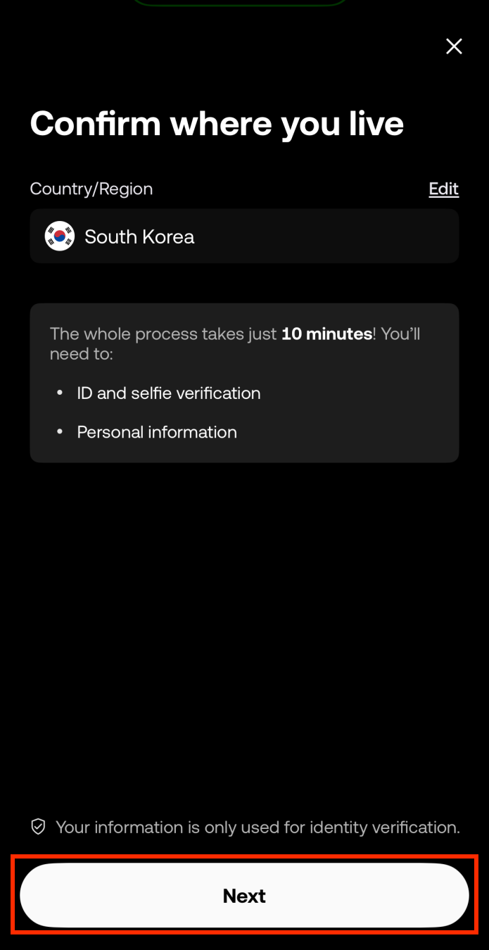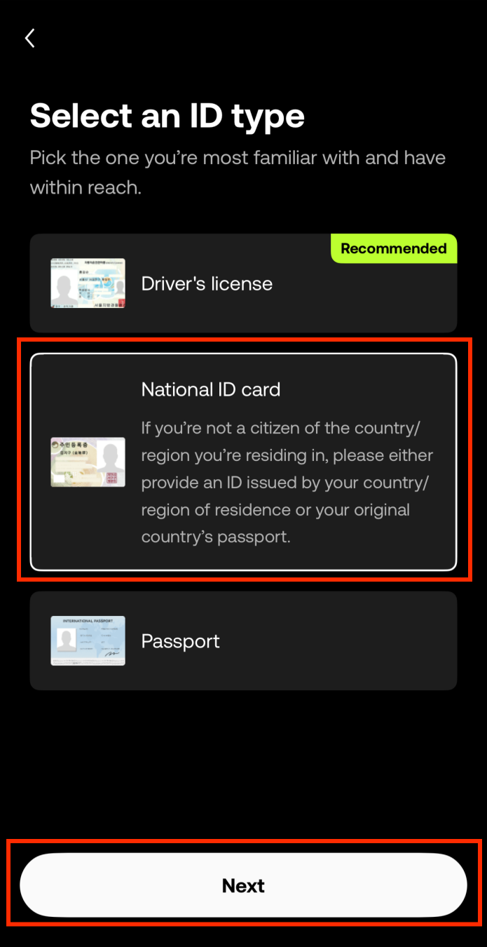 - 신분증, 운전면허증, 여권 중 한 가지를 골라 신원인증(KYC)을 진행합니다.