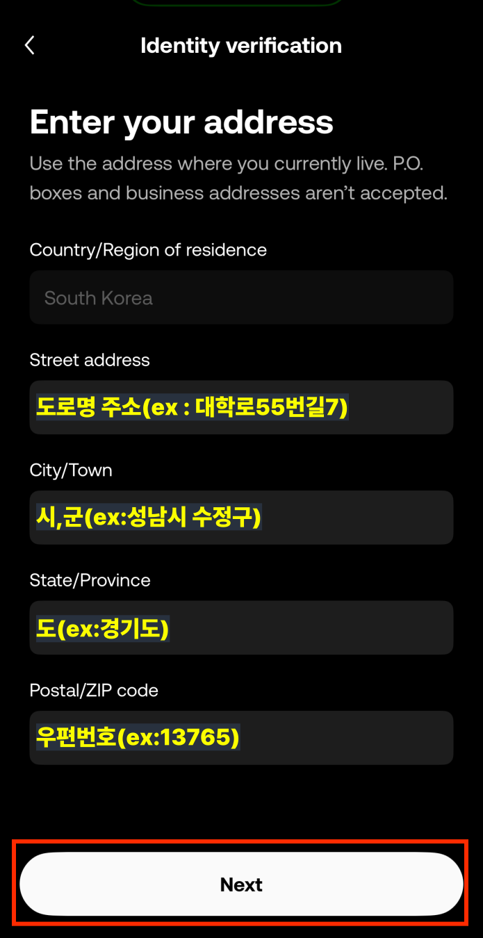 - 이어지는 화면에서 이름과 생년월일, 주소, 우편번호를 입력하시면 됩니다.