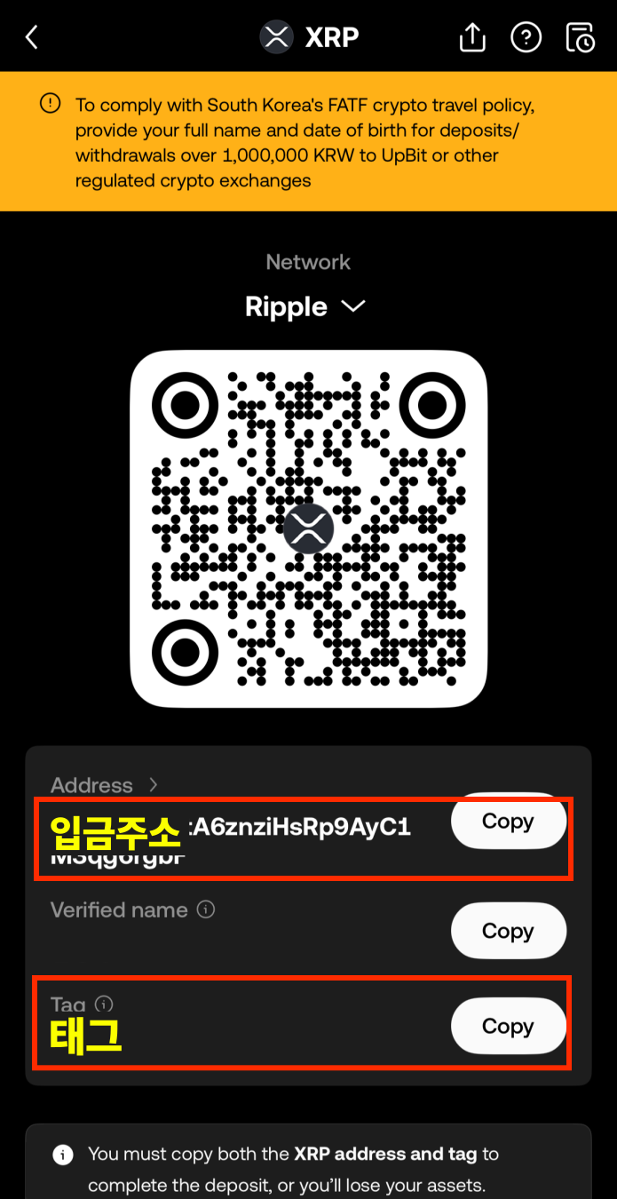 - 생성된 입금 주소와 Destination Tag를 확인해 둡니다.