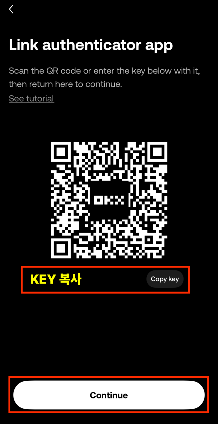 - 다시 OKX로 돌아와 셋업 키를 복사 후 Continue를 눌러줍니다.