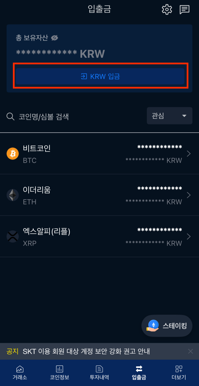 ① 업비트 앱 실행 → 하단의 입출금 메뉴 클릭