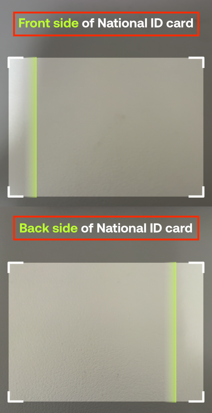 - Front side of National ID card에서는 신분증의 앞면을, Back side of National ID card에서는 신분증의 뒷면을 촬영해 주시면 됩니다.