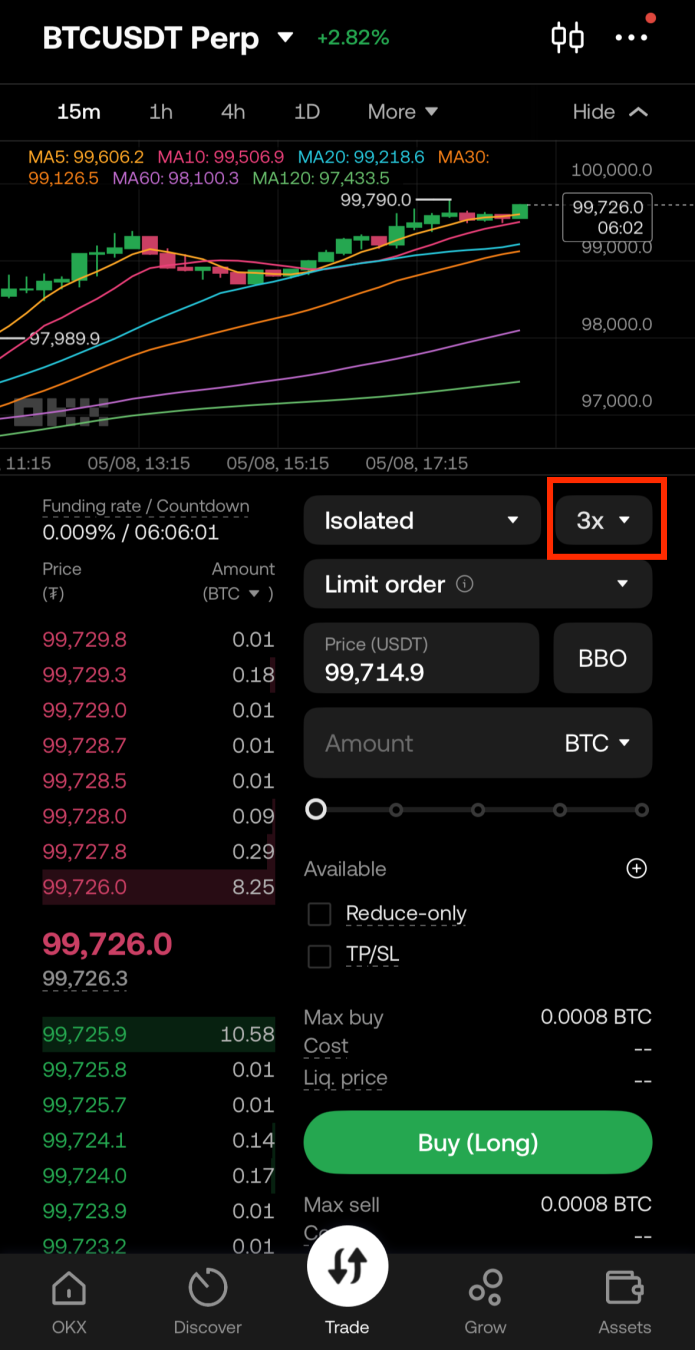② 팝업 메뉴에서 원하는 레버리지 배율을 선택합니다. OKX는 최대 125배 레버리지를 지원합니다.