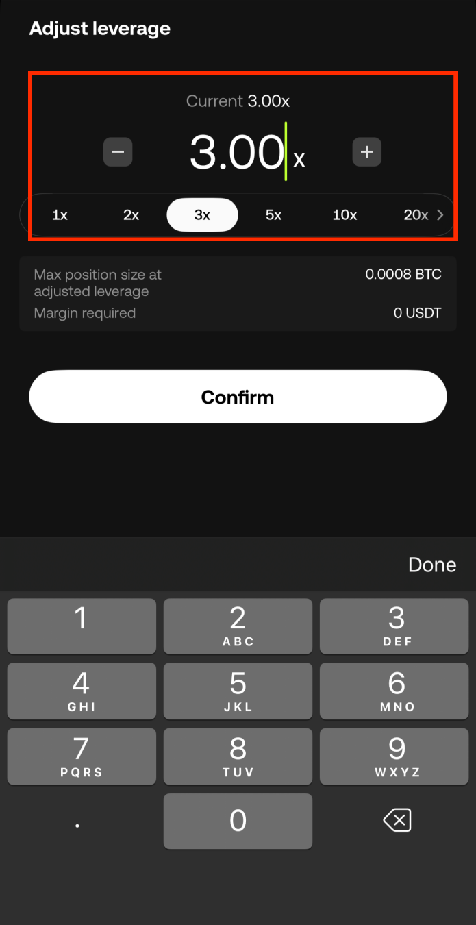 ① 거래 화면에서 'Leverage (레버리지)' 설정 버튼을 클릭합니다.