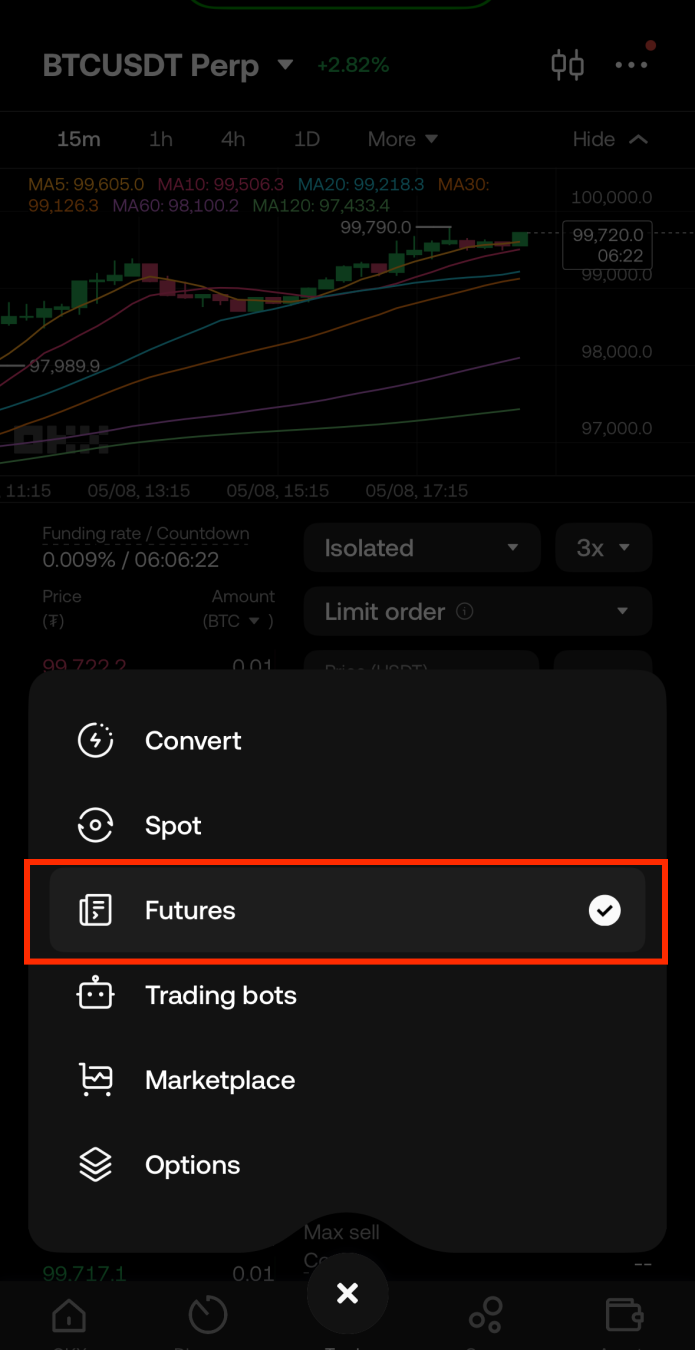- OKX 앱을 실행하고 하단 메뉴에서 'Trade'를 클릭합니다.