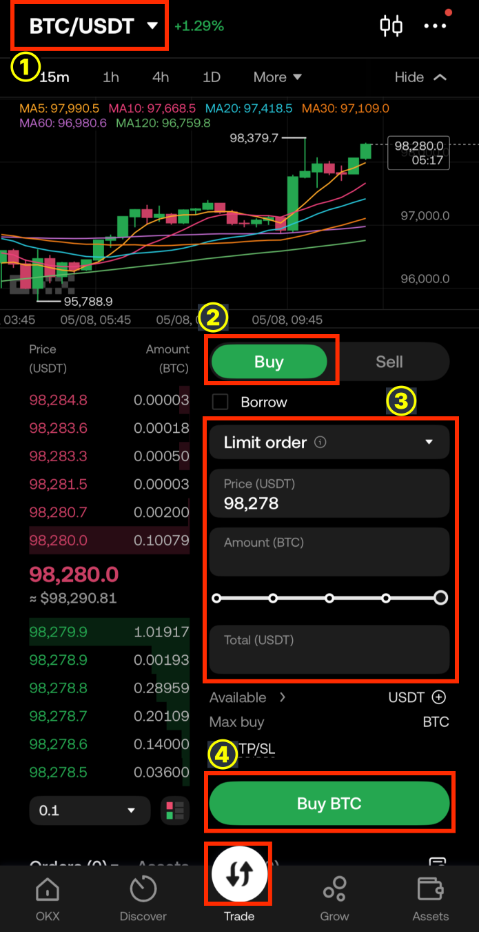 - OKX 앱을 실행하고, 하단 메뉴에서 'Trade'를 클릭합니다.