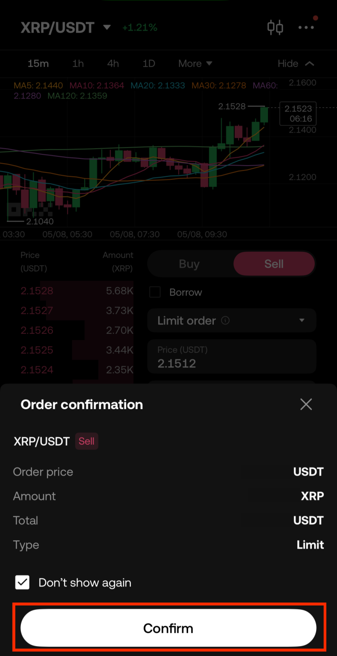 - Market Order(시장가)의 경우 즉시 체결되며, Limit Order(지정가)의 경우 설정한 가격에 도달하면 체결됩니다.