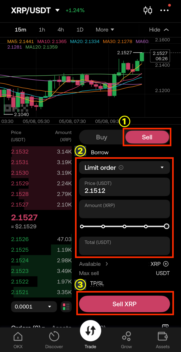 - 주문방식 및 가격과 수량을 선택한 후 Sell XRP를 눌러줍니다.