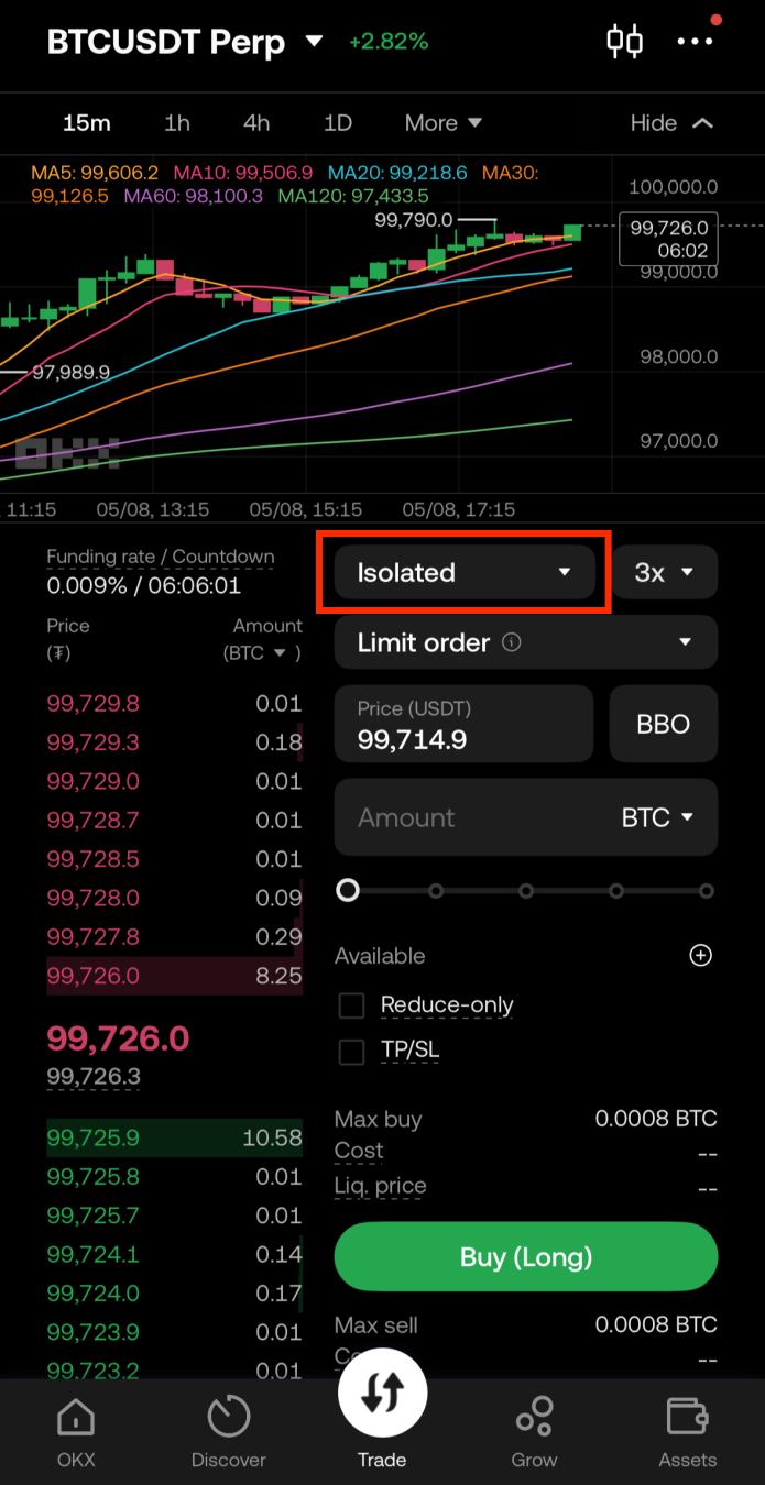 - Isolated Margin (격리 마진): 투자한 금액만큼만 증거금으로 설정하여 거래. 강제청산 시 투자 금액만 손실됩니다.