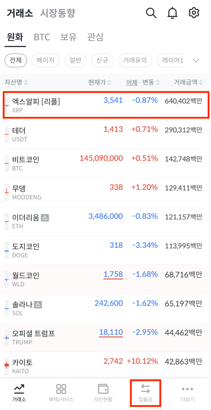 입출금 탭에서 엑스알피[리플]를 선택합니다.