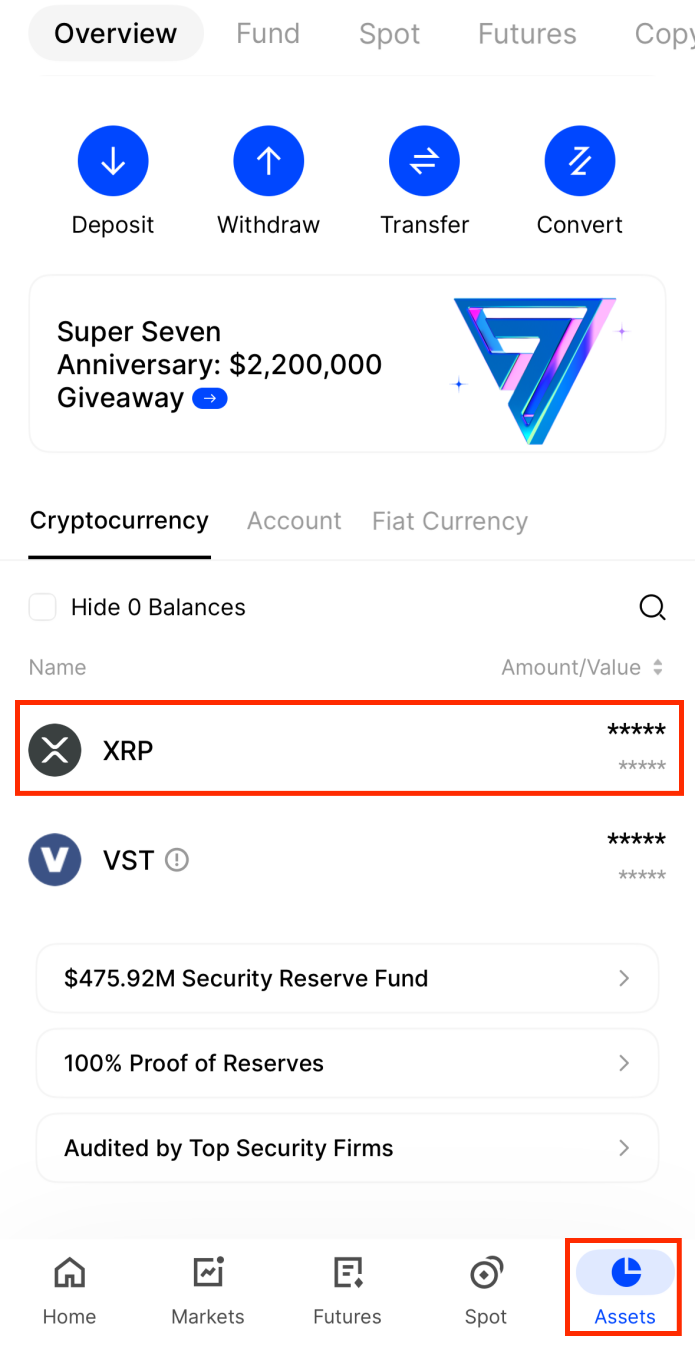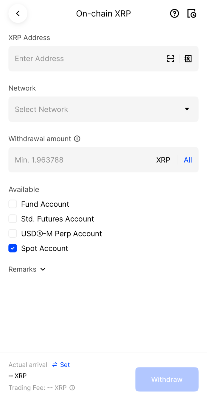 Fund로 입금 받은 'XRP'를 코인 거래를 위해 'Spot Account'로 옮겨줍니다.