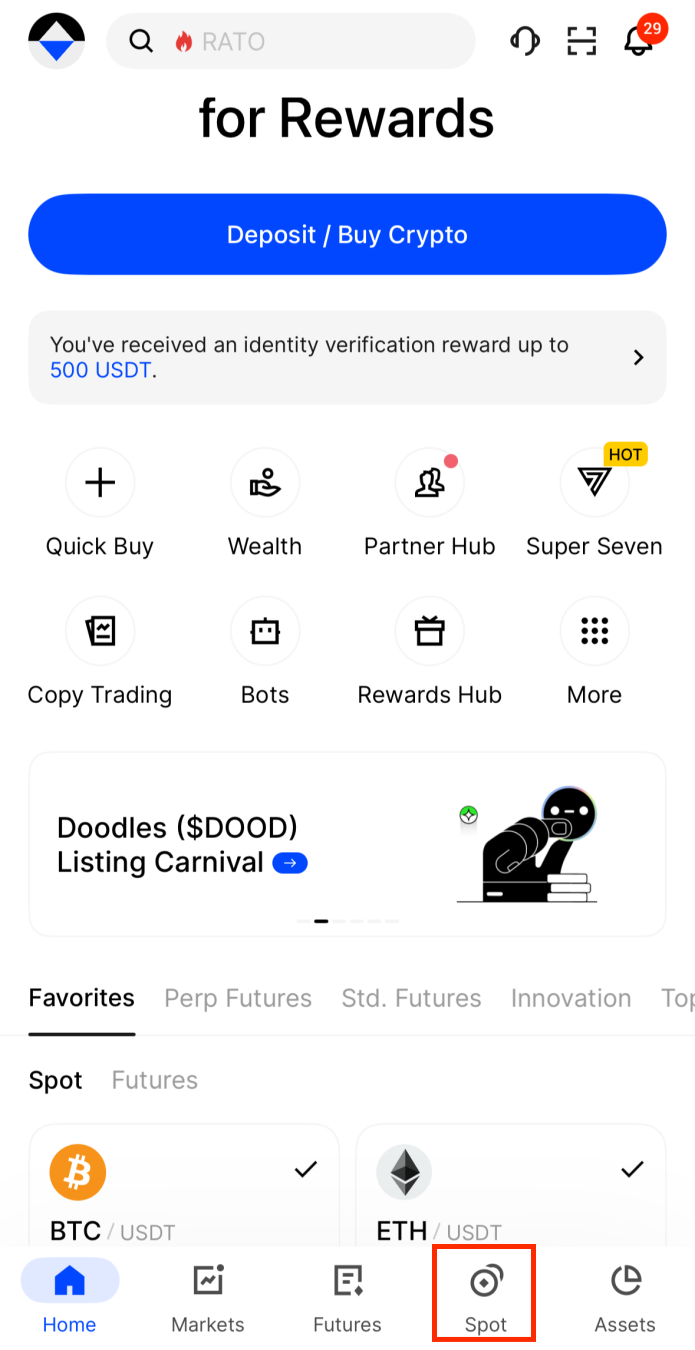 ① 팝업 메뉴가 나타나면 Spot을 선택해 현물거래 화면으로 이동합니다.