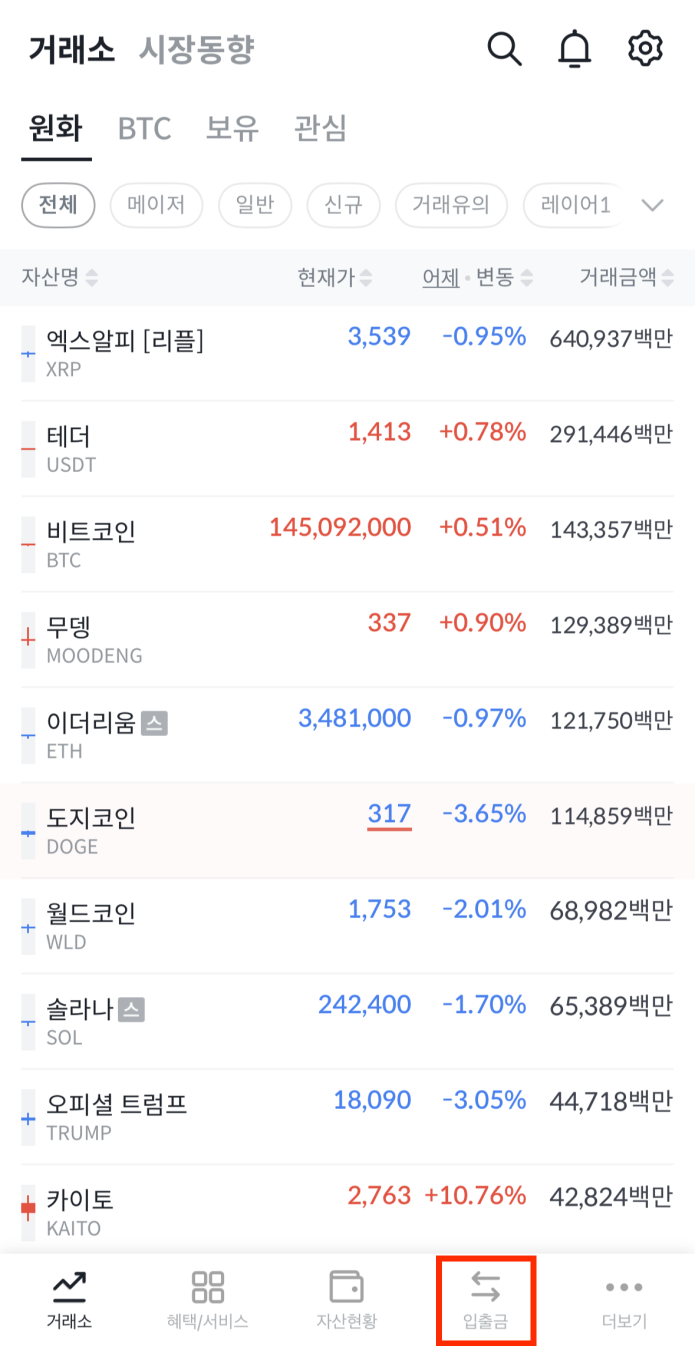 빗썸 앱을 실행한 후, 하단의 입출금 메뉴를 클릭합니다.