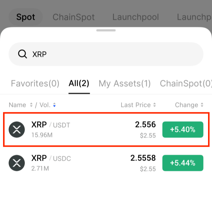 코인 리스트에서 'XRP'를 검색 후 XRP/USDT를 선택합니다