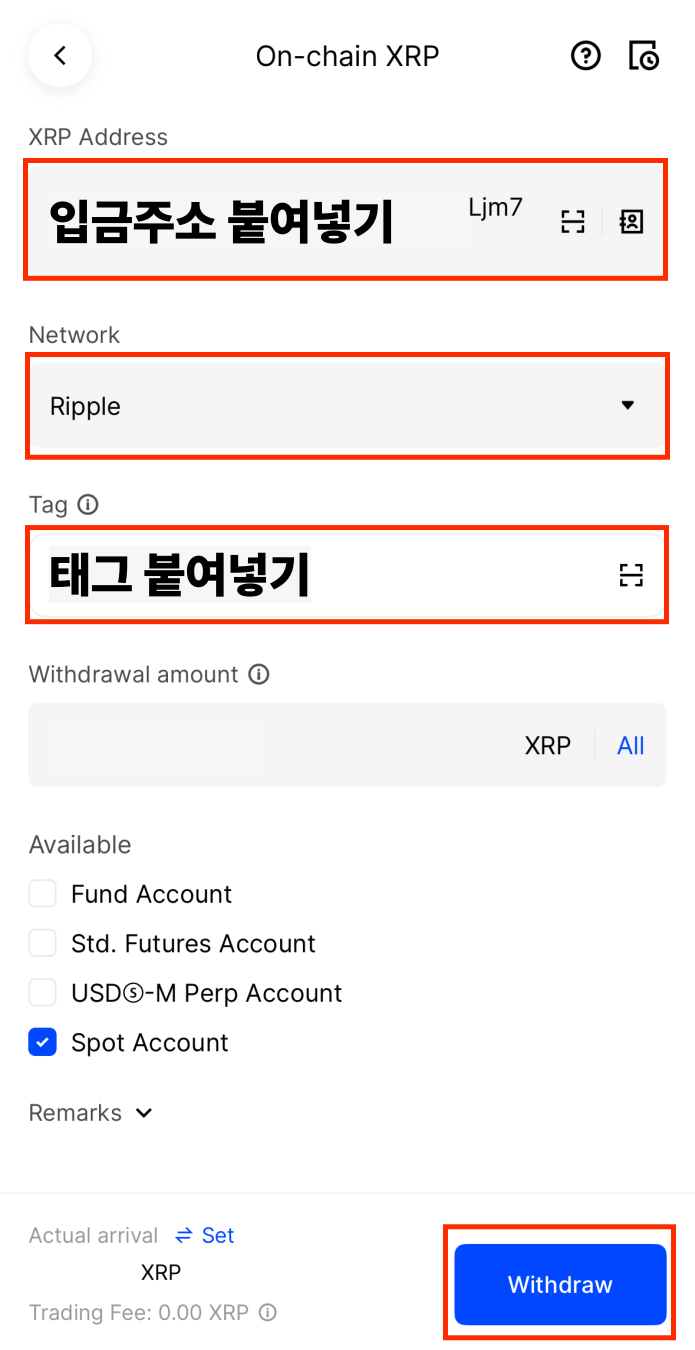 화면에 표시된 XRP 입금주소와 데스티네이션 태그를 복사합니다.