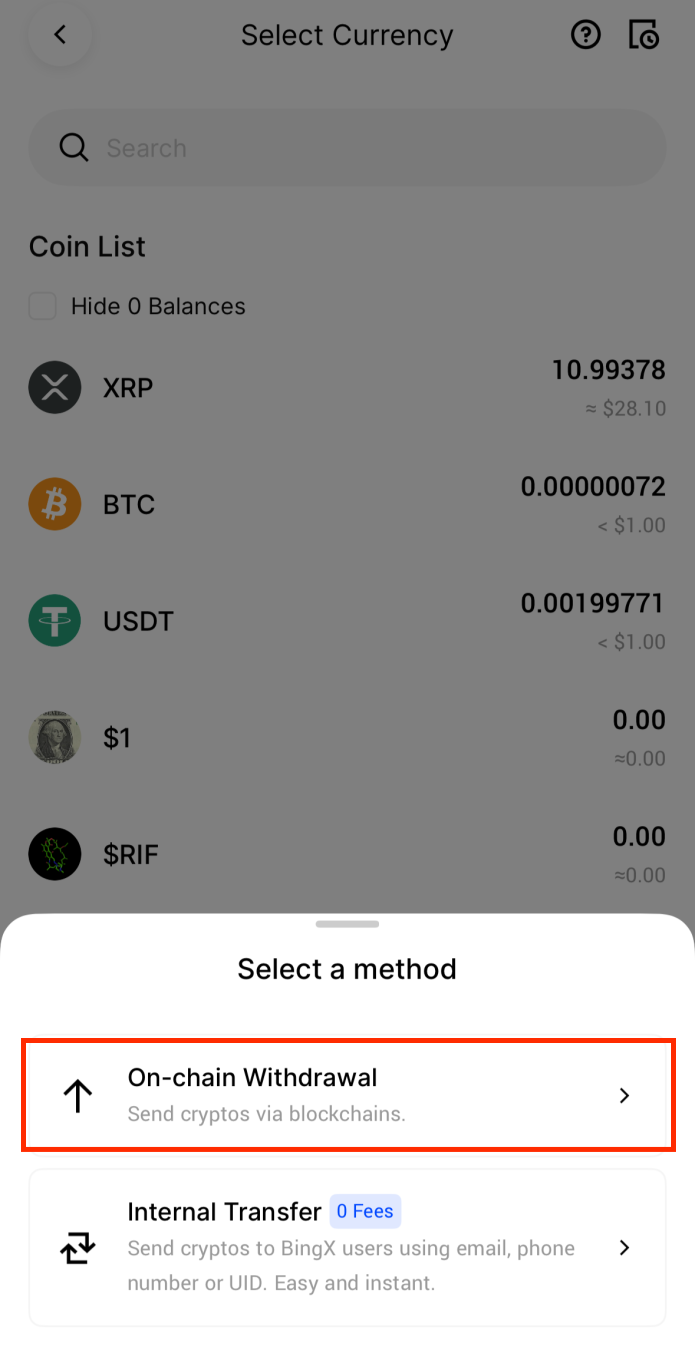 이어지는 화면에서는 출금 방식으로 On-chain Withdrawal을 선택합니다.