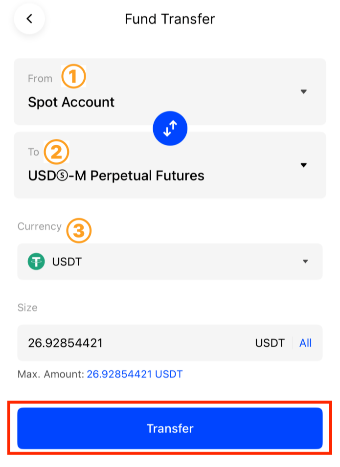- 아래 과정을 통해 Spot에 있던 테더(USDT)를 선물 거래용으로 전환합니다.