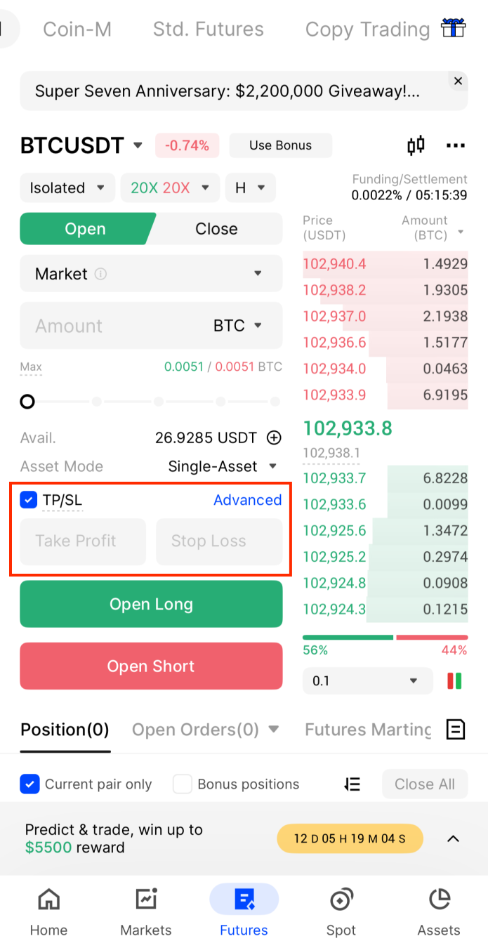 추가로 TP/SL 기능을 통해 자동 청산 기능을 활용할 수 있습니다.
