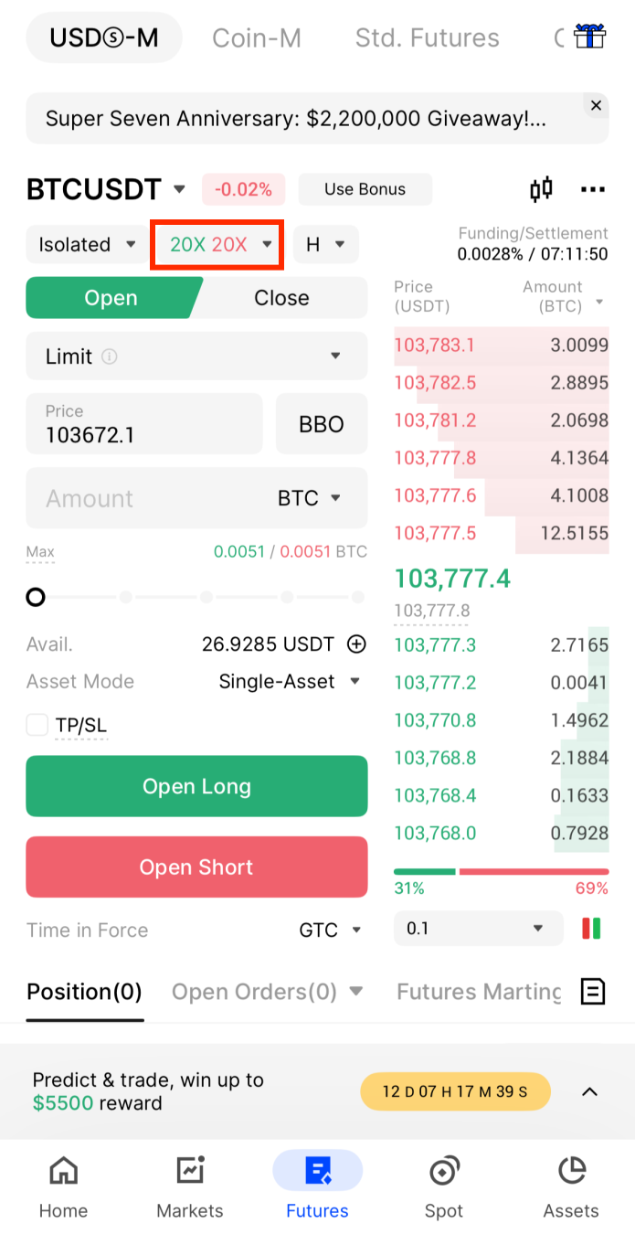 ② 롱/숏 각각의 배율을 설정합니다. (예: Long 20x / Short 20x)