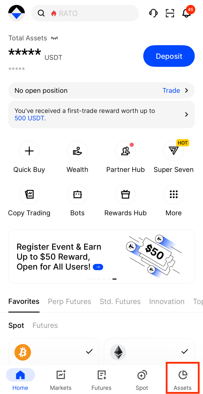 - 빙엑스 앱 실행 후 하단 메뉴에서 Assets를 클릭합니다.