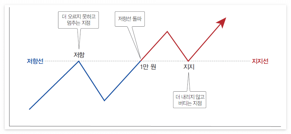 지지선은 하락하던 가격이 멈추고 반등하기 쉬운 구간이며, 저항선은 상승하던 가격이 멈추고 하락할 가능성이 큰 구간입니다. 과거에 많이 거래된 가격 구간일수록 심리적 저항이나 지지 작용이 강하게 나타납니다.