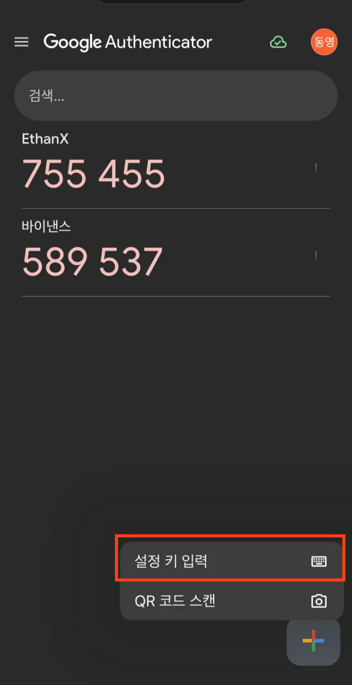 - 복사한 KEY를 구글 OTP 앱으로 들어와 설정 키 입력을 누르고 붙여넣습니다.