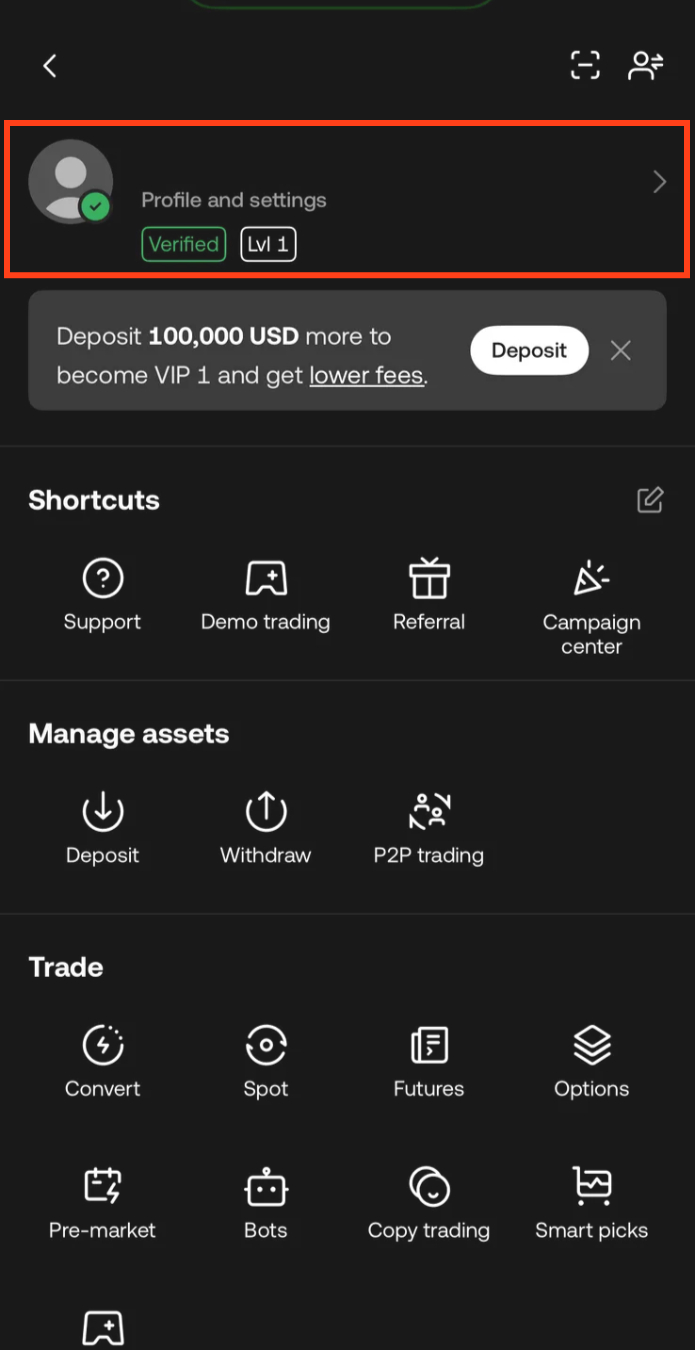이후 출금을 하기 위해서는 2단계 인증(Google Authenticator) 설정이 필수입니다. OKX 어플을 키고 프로필 아이콘을 눌러주세요.