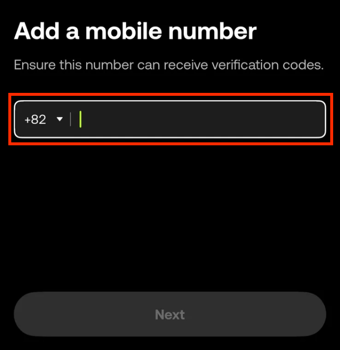 - 이어서 휴대폰 인증을 진행합니다. 휴대폰 번호를 입력 후 Next를 눌러주세요.