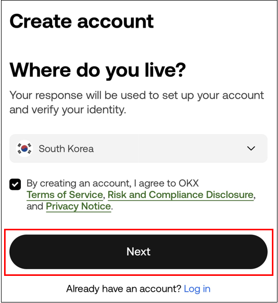 - 국적을 South Korea로 선택 후 Next를 클릭합니다.