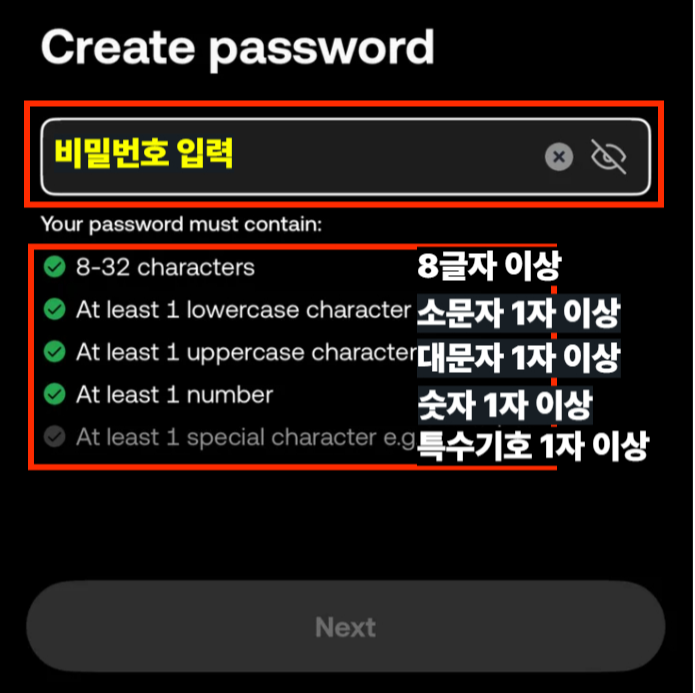 - 다음으로는 아래 조건에 맞게 비밀번호를 입력 후 'Next'를 눌러줍니다.