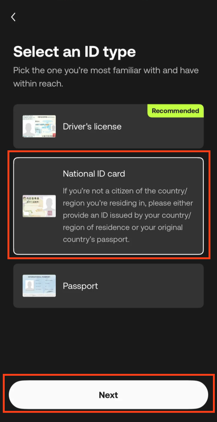 - 먼저 국적을 'South Korea'로 설정하고 Next를 눌러 신분증 종류를 선택합니다.