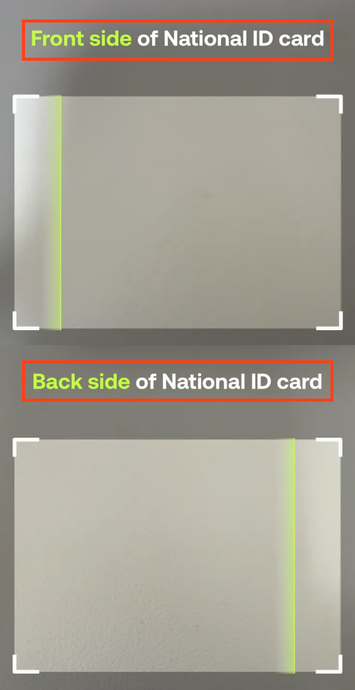 - 카메라 화면에 맞춰 신분증의 앞면(Front)과 뒷면(Back)을 촬영합니다.