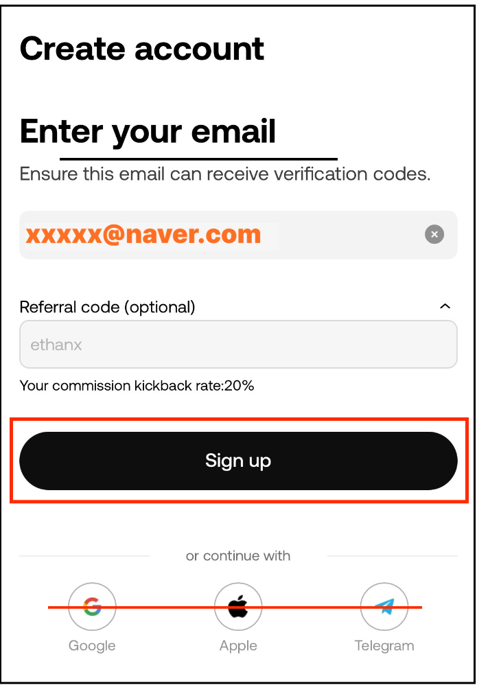 - 빈칸에 이메일 또는 휴대폰 번호 입력 후, Referral code를 확인, 'Sign up'을 클릭합니다.
