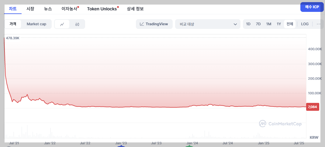 많은 사람들이 ICP를 ‘죽은 코인’으로 인식하게 된 결정적 이유는 2021년 출시 직후의 가격 폭락 때문입니다. 상장가는 $700 이상이었으나, 이후 단기간에 90% 이상 하락하면서 투자자들의 신뢰를 크게 잃었죠.