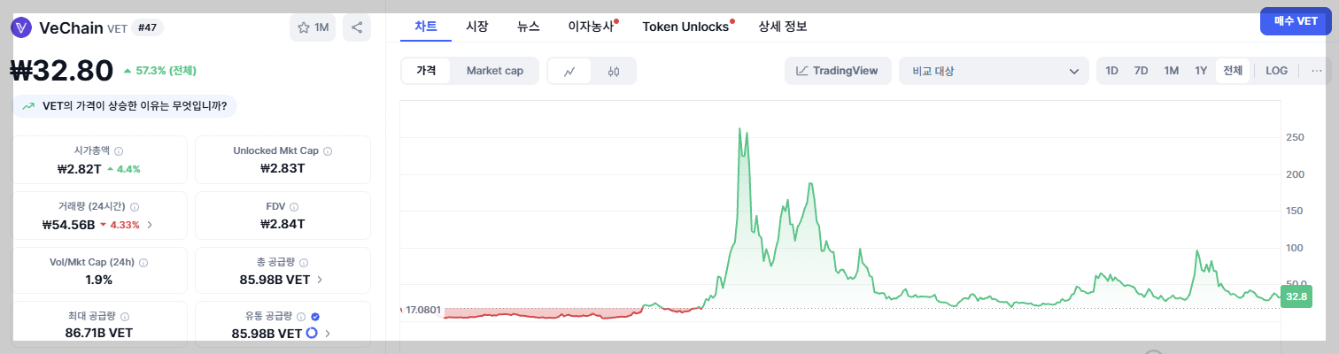2025년 현재 VET는 고점 대비 약 85% 하락한 구간에서 거래되고 있으며, 시가총액 기준 40~50위권에서 꾸준히 유지되고 있습니다. 이는 투기적 관심은 줄었지만, 기술 기반의 장기 보유자 비율이 늘어났다는 신호로도 해석할 수 있습니다.