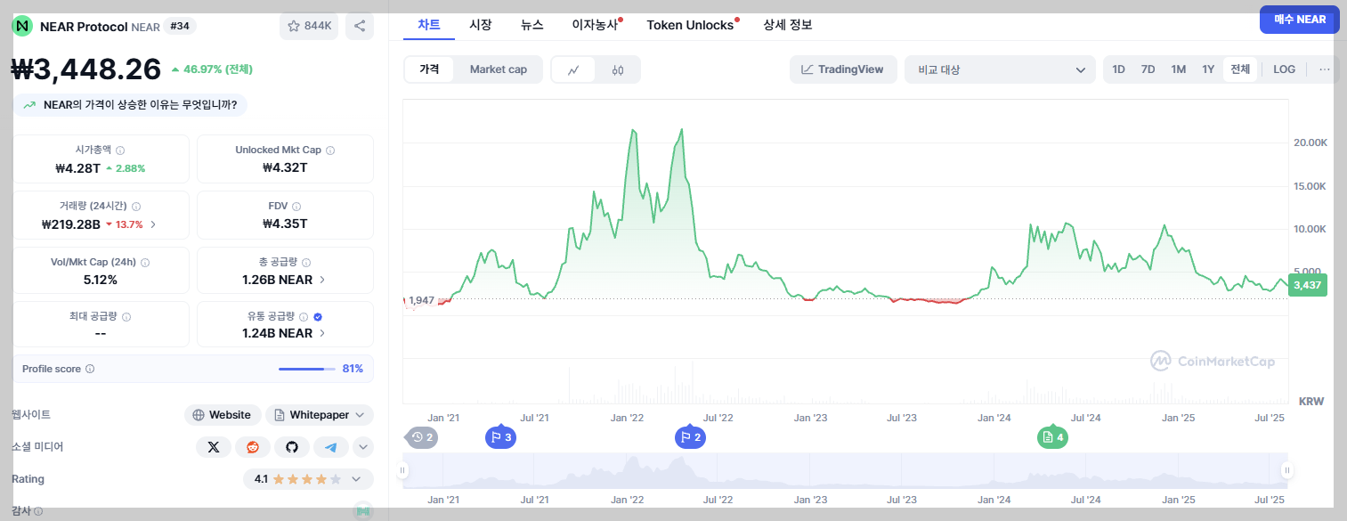 2025년 현재 NEAR는 시총 기준 약 25~30위권을 유지하고 있으며, 고점 대비 약 70% 이상 하락한 상태입니다. 이는 구조적으로는 저평가 구간이지만, 여전히 유동성과 디앱 수요가 충분치 않다는 점을 감안해야 합니다.