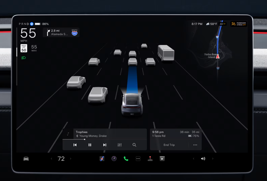 2025년 현재 미국에서는 FSD v12.3.x 버전이 일부 유저에게 제공되고 있으며, 시내 주행, 신호 인식, 회전, 좌우 변경 등을 스스로 수행합니다.