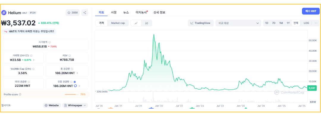 HNT는 2021년 강세장에서 최고 약 $55 이상까지 상승했지만, 이후 시장 전반의 하락과 함께 가격은 크게 조정받았습니다. 그러나 최근에는 다시 IoT 및 5G 수요 확대, 파트너십 확장과 함께 저점을 다지는 흐름을 보이고 있으며, 거래소 재상장이나 TVL 상승과 같은 모멘텀도 기대되고 있습니다.