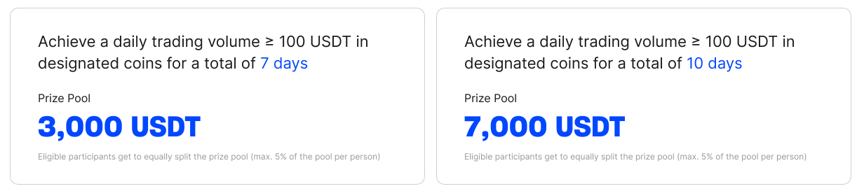 • 일일 거래량 ≥ 100 USDT, 10일 출석 → 7,000 USDT 균등 분배