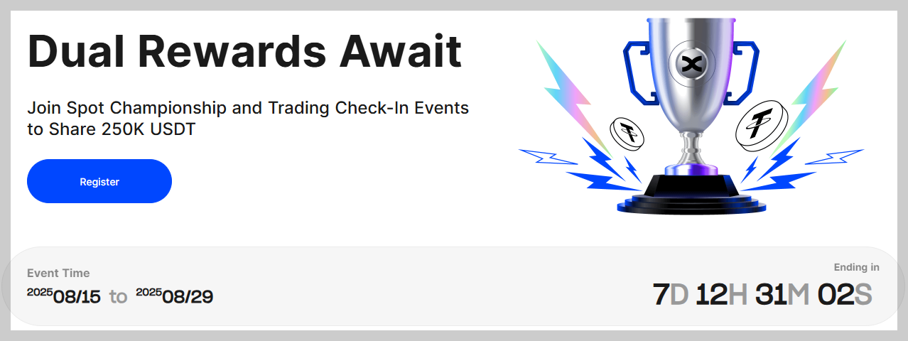 Spot Championship과 Trading Check-In 이벤트에 참여하고 총 250,000 USDT 상금을 나눠가질 수 있는 기회가 열렸습니다. 지정된 코인 거래와 출석 이벤트를 통해 보상을 동시에 받을 수 있는 더블 리워드 혜택을 확인해보세요!