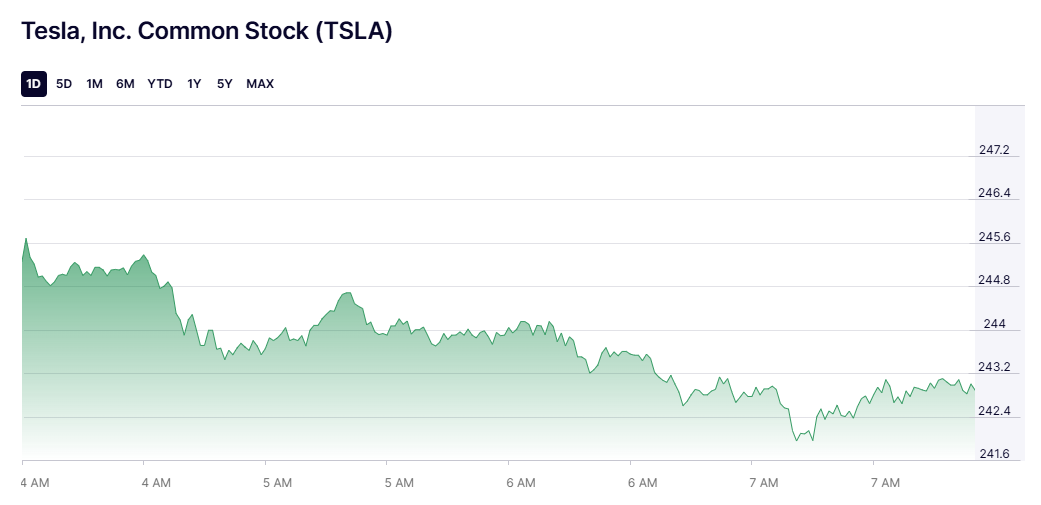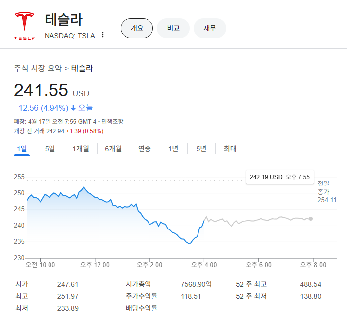 2025년 4월 17일, 테슬라 주식(TSLA)은 241.55달러로 거래되고 있습니다(나스닥 공식, Nasdaq).