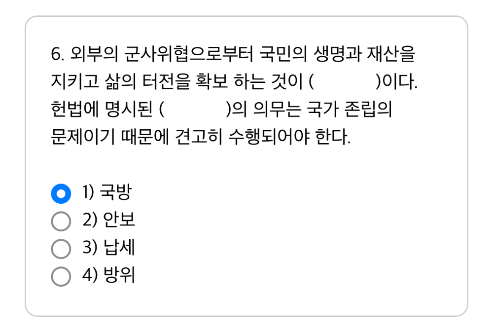 6. 외부의 군사위협으로부터 국민의 생명과 재산을 지키고 삶의 터전을 확보 하는 것이 (⠀⠀⠀ ⠀)이다. 헌법에 명시된 (⠀⠀⠀ ⠀)의 의무는 국가 존립의 문제이기 때문에 견고히 수행되어야 한다.