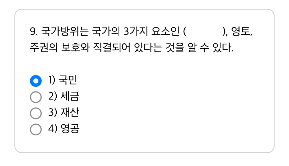 9. 국가방위는 국가의 3가지 요소인 (⠀⠀⠀ ⠀), 영토, 주권의 보호와 직결되어 있다는 것을 알 수 있다.