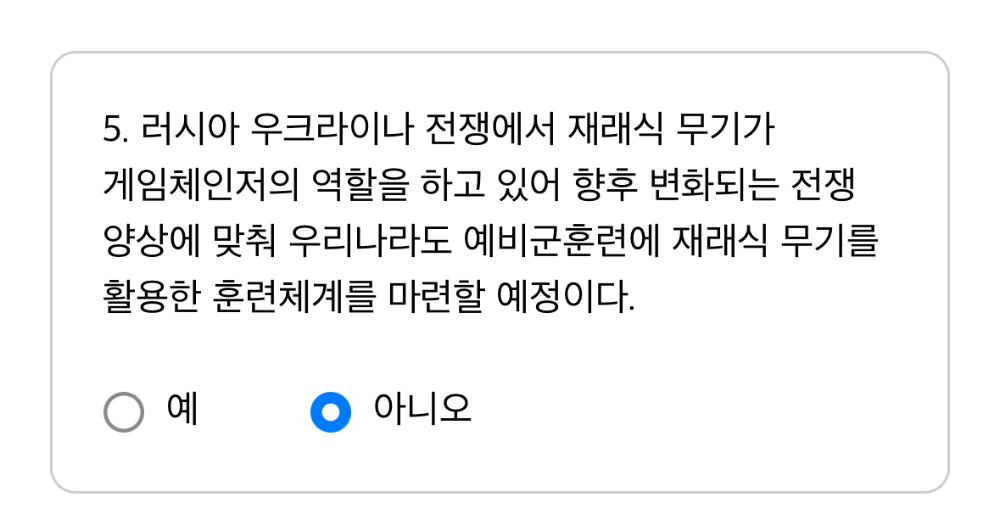 이유: 러시아-우크라이나 전쟁에서 재래식 무기뿐만 아니라 드론, 사이버전 등 첨단기술이 중요한 역할을 하고 있으며, 한국은 이미 재래식 무기 훈련을 포함한 종합적 훈련체계를 운영 중이다. 따라서 재래식 무기 중심의 새로운 훈련체계 마련은 현재 계획에 부합하지 않는다.