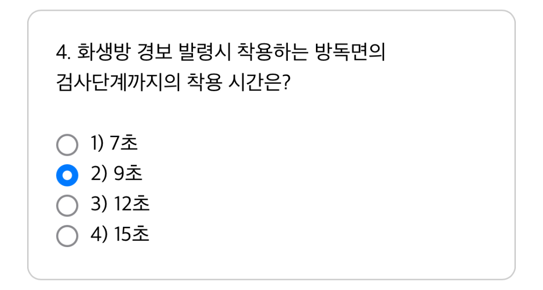 이유: K1 방독면 착용 및 기밀 검사(호흡 확인, 정화통 점검)는 9초 이내에 완료해야 하며, 이는 예비군 훈련 표준입니다. 7초는 너무 짧고, 12초나 15초는 기준 시간을 초과하므로 9초가 적절합니다.