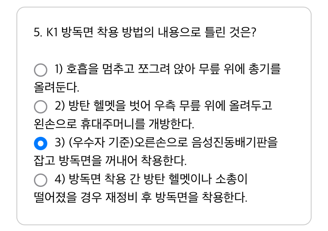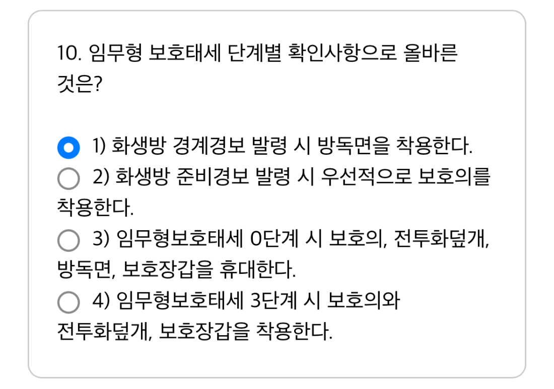 정답: 1) 화생방 경계경보 발령 시 방독면을 착용한다.