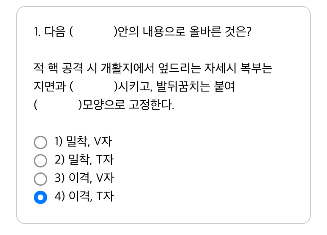 1. 적 핵 공격 시 개활지에서 엎드리는 자세 시 복부는 지면과 (⠀⠀⠀)시키고, 발뒤꿈치는 붙여 (⠀⠀⠀)모양으로 고정한다.
